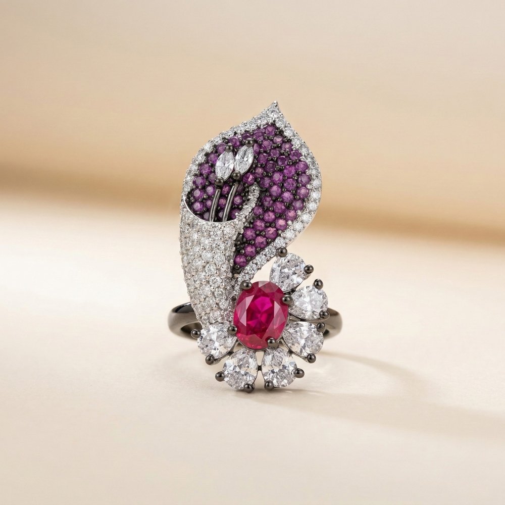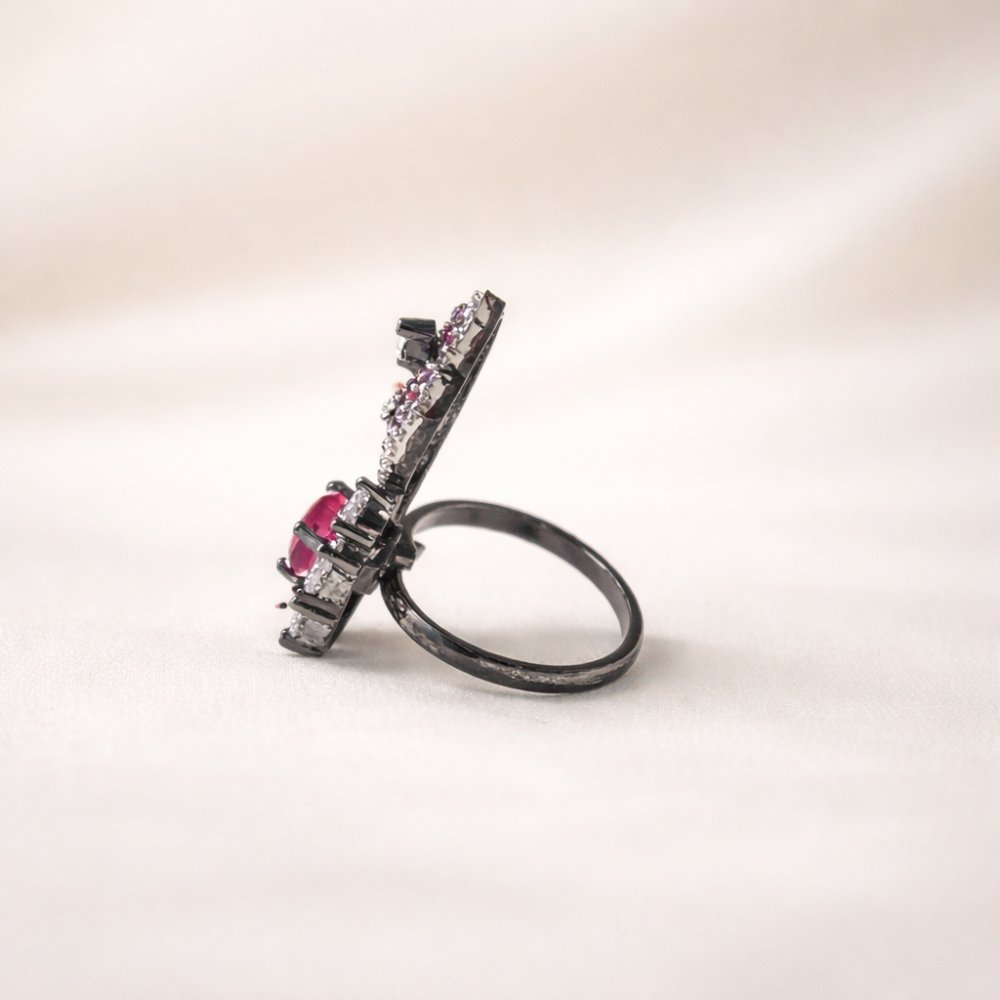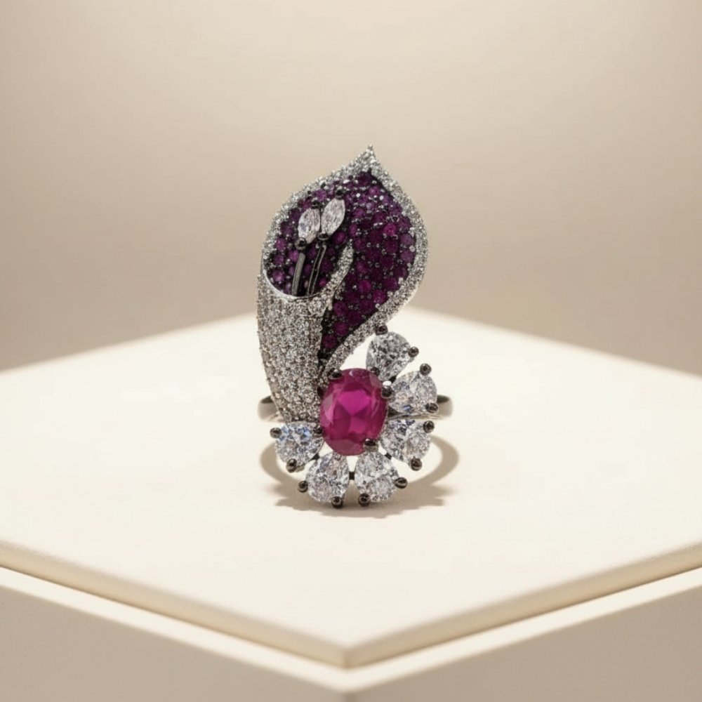 The Adjustable Ruby Floral Statement Ring is designed to capture attention with its bold and artistic appeal. Featuring a vibrant ruby-toned center stone surrounded by delicate floral detailing, this ring reflects a perfect blend of elegance and statement design.