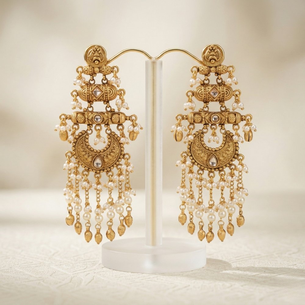 The beautifully structured chandbali design features ornate patterns and fine engravings, enhanced with subtle stone accents that add a refined sparkle. The highlight of these earrings is the graceful arrangement of pearl clusters and cascading pearl danglers, creating a soft movement and luxurious finish.