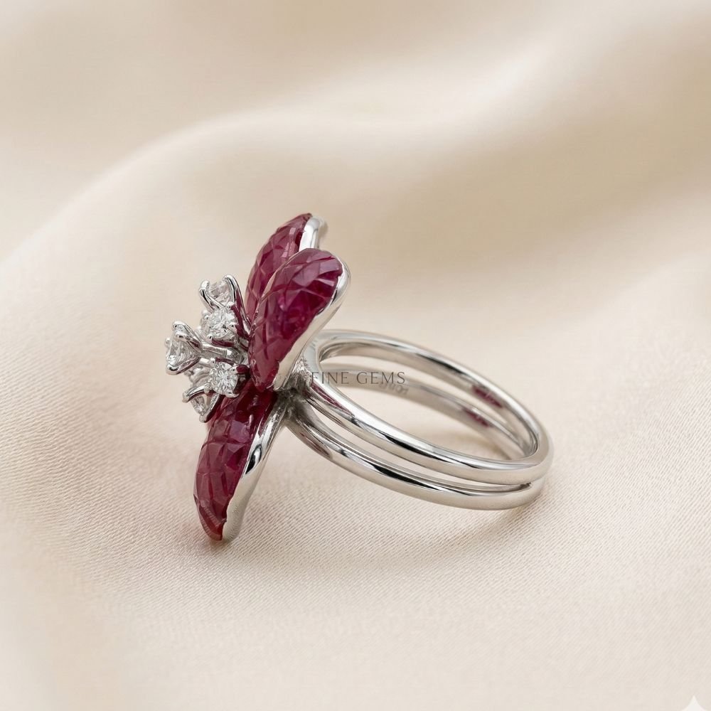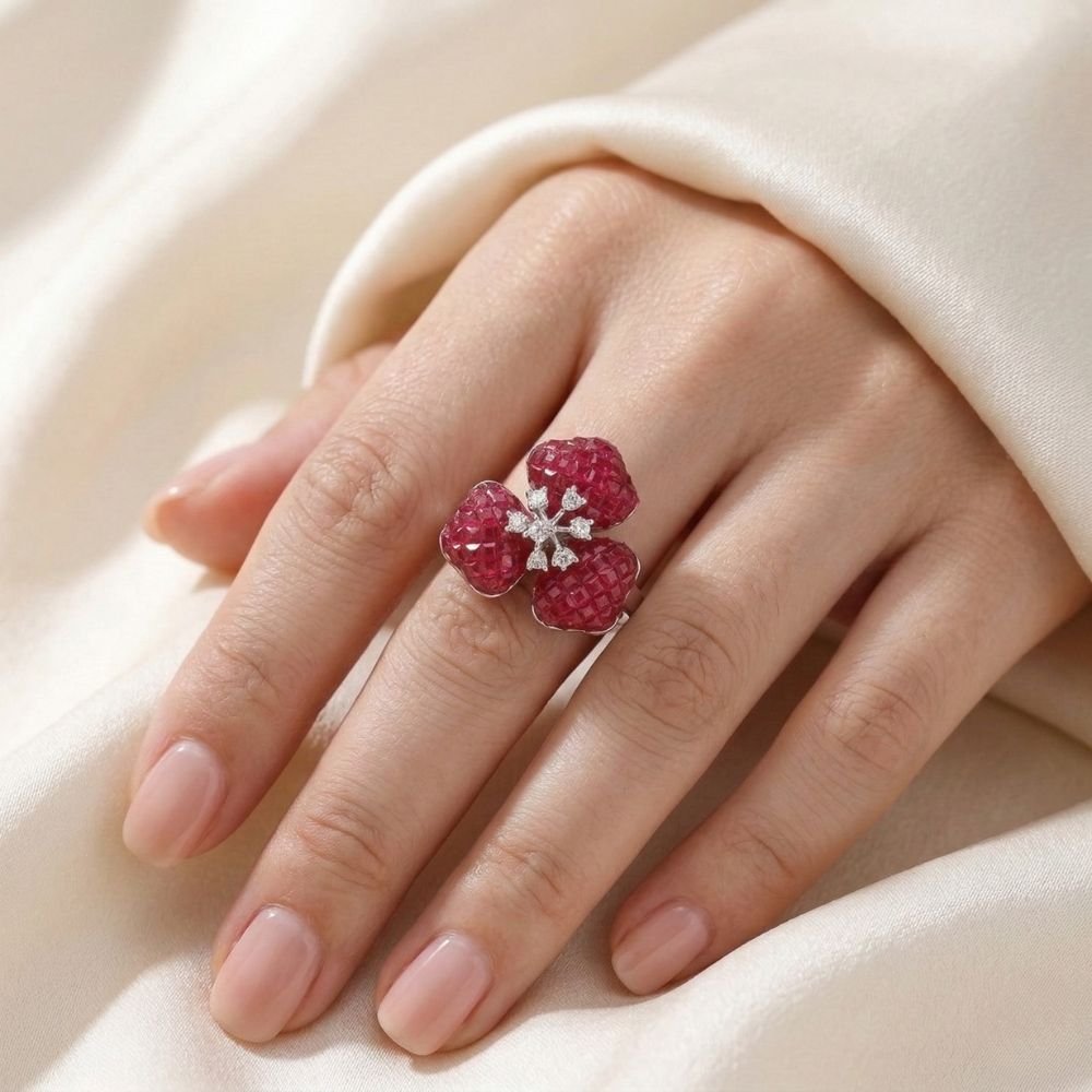 The Diana Ruby Red Floral Ring is a refined statement piece that blends elegance with modern craftsmanship. Designed in a delicate floral pattern, this ring features rich ruby red stones set using an invisible setting technique, creating a smooth and seamless surface with enhanced brilliance.