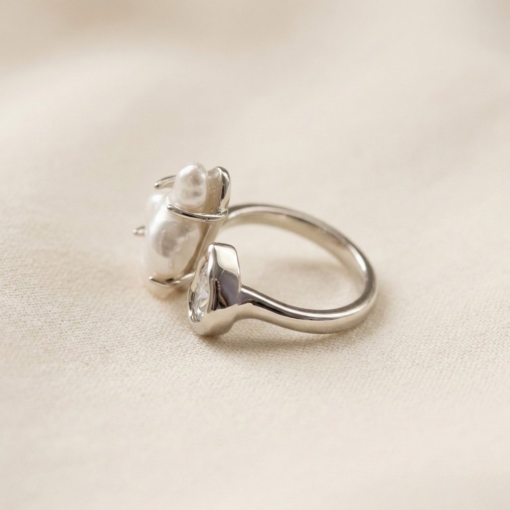 This elegant statement ring features a modern partially open design, beautifully enhanced with dual pearl accents. The combination of soft pearls and sparkling cubic zirconia detailing creates a perfect balance of sophistication and contemporary style.