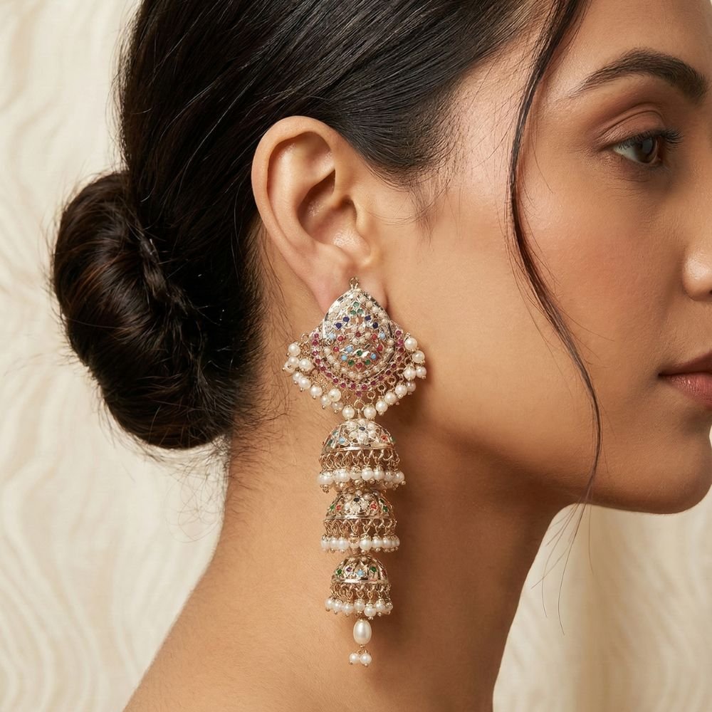 The Jadau Triple Layer Navratna Jhumka is a stunning expression of traditional Indian craftsmanship. Designed with intricate jadau work, these earrings feature a beautiful arrangement of Navratna-inspired stones that bring vibrant color and cultural richness to the design.