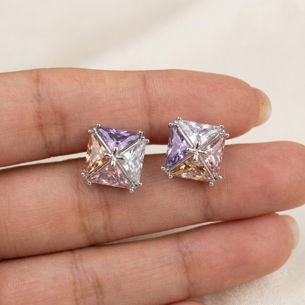 The Multi Stone Anti-Tarnish Crystal Studs from Aliana Jewels are a stylish blend of modern geometry and vibrant sparkle. Designed in a unique multi-faceted structure, these studs feature beautifully arranged multicolor crystal stones in soft tones of lavender, champagne, and clear hues.